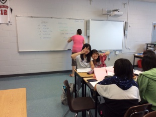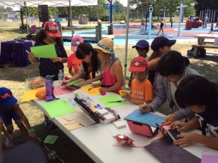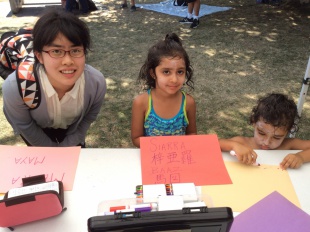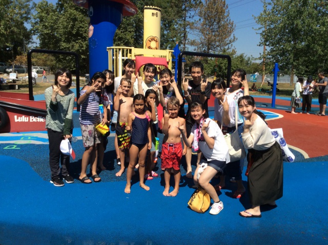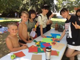 午後からは、近くの公園へ行きました。地域の子どもたちと水遊びをして戯れるグループもいれば、折り紙で鶴やこまを教えたり、漢字で名前を書いたりして、子どもたちにプレゼントするグループもいて、子どもたちにはどちらのグループも人気でした。初めはお互いになかなか近寄りがたい様子でしたが、先生のアドバイス通り、勇気を出して自分たち主導で歩み寄り、打ち解けあうことが出来ました。水遊びチームは最後には仲良くなって集合写真を撮りました。語学研修も後半に入り、主体的に英語を話すようになってきたようです。