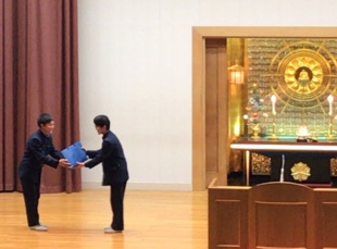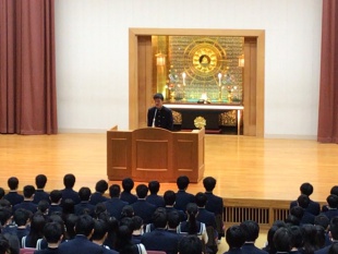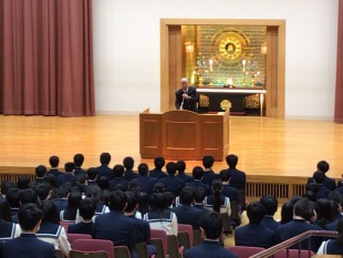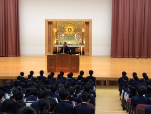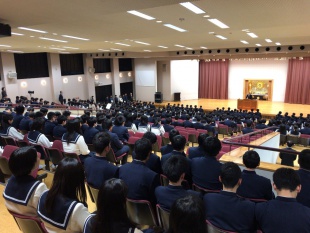 センター試験壮行会では,土井校長先生,進路部長の亀井先生,および生徒会より激励のお言葉をいただきました。そののち,中6高3代表よりお礼の言葉がありました。