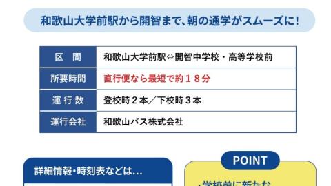 令和8年4月より和歌山大学前駅から開智までのバス路線を開設予定をしています。 現在は「認可申請中」であり、バスの運行時間等は現在調整中です。 南海沿線からの通学がこれまで以上に便利になることで、生徒...