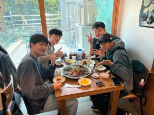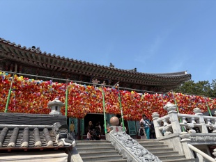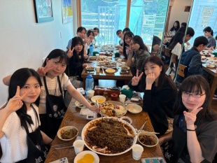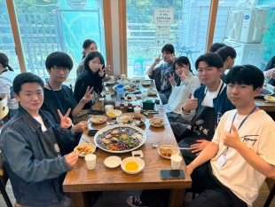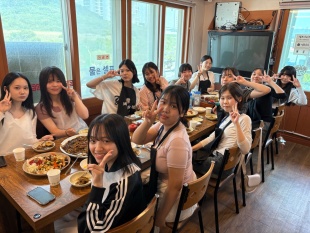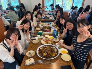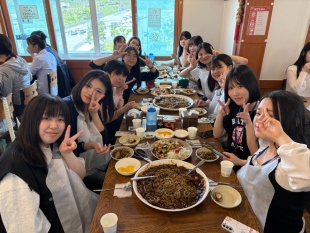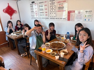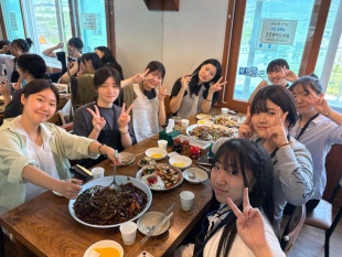 2025年05月31日(土) 国際交流 < お知らせ < 最新ニュース 韓国姉妹校交流4 韓国2日目、ペアの学生と合流して龍宮寺に行きました。海の近くのお寺ということもあり、絶景が広がっていました。 今日のランチはジャージャー麺と酢豚です。少しピリ辛ですが、お水を片手に美味しくいただきます! 午後からはロッテワールドです!お天気にも恵まれました。ここでペアの学生とみんなで集合写真! 夕方からは西面に行って自由行動です。一緒に夜ご飯を食べてショッピングをして、楽しい時間を過ごした後は涙涙のお別れでした。トマンナヨ〜! 明日で韓国最終日です。