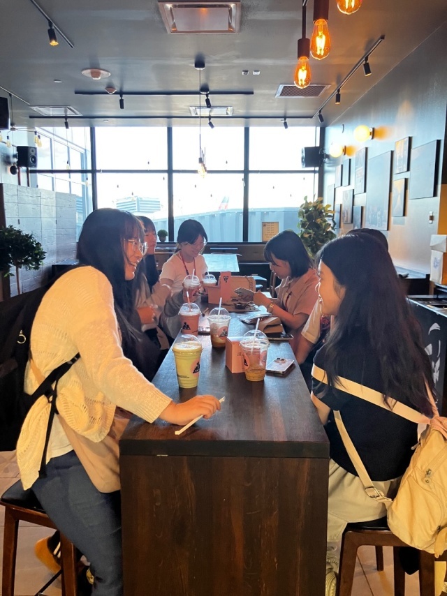 2025年08月21日(木) 国際交流 < お知らせ < 最新ニュース グローバルリーダー研修 in Boston ミネアポリス乗り継ぎ 現在、ミネアポリスで乗り継ぎ待ちです。 無事全員入国審査が済み、ここから2グループに分かれてボストンにむかいます。 すでに1グループ目は出発し、2グループ目はカフェでゆっくり出発を待っています。