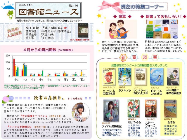 2016年06月08日(水) 図書館だより < お知らせ < 最新ニュース 図書館ニュース3号を発行しました 先月最も貸出が多かった本は宮下奈都さん『羊と鋼の森』でした。 ピアノ調律師の青年のお話です。 本屋大賞で1位を獲得した本ですから、生徒の注目を浴びています。 また、今月は受験生にインタビューをしました。 毎日受験勉強に励んでいますが、時折息抜きに読書するのが癒しなんだそうです。 紹介してくれている『君の膵臓をたべたい』『アイドル受験戦記』は図書館にあります。