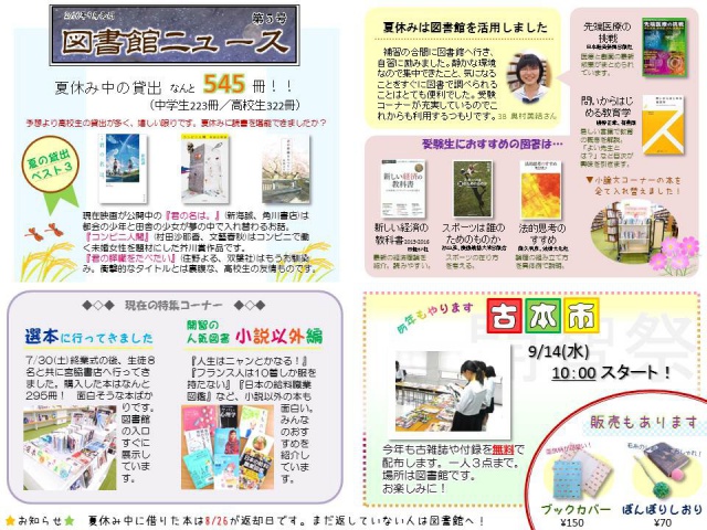 2016年09月06日(火) 図書館だより < お知らせ < 最新ニュース 図書館ニュース5号を発行しました 夏休み中はたくさんの貸出がありました。 中学生も高校生もたくさん読書をしてくれて嬉しい限りです。 また、今月は受験に役立つ図書を紹介しています。 受験生の皆さんは大学入試の二次試験に向けて参考にしてください。 プリントアウトはこちら