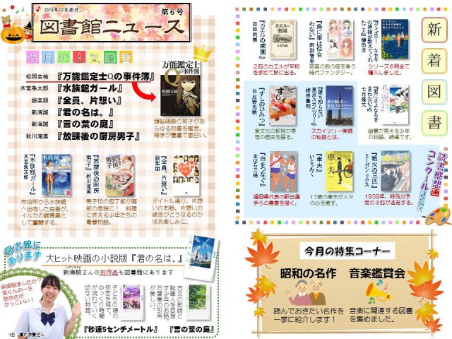 2016年10月03日(月) 図書館だより < お知らせ < 最新ニュース 図書館ニュース6号を発行しました 10月に突入しました。 読書の秋!ということで、今回の図書館ニュースでは本紹介を多めにしました。 「読書感想画コンクール」の課題図書も購入しましたので紹介しています。 ぜひ図書館へ借りに来てください。 プリントアウトはこちら