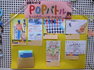 2016年11月25日(金) 図書館だより < お知らせ < 最新ニュース 入口でPOPバトル開催中! 現在 図書館入口の掲示板でPOPバトルを開催しています! 図書同好会のメンバーが好きな本の紹介イラストを描きました。 シールで誰でも投票できます。 みなさん見に来てください!