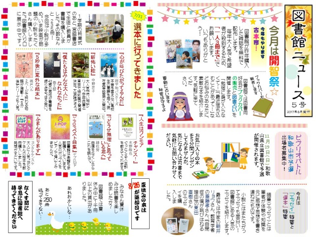2017年09月07日(木) 図書館だより < お知らせ < 最新ニュース 図書館ニュース5号を発行しました 今回は7月末に行った選本を特集しています。 生徒と教員がたくさんの本を選んでくれました。 また、今月11日と12日に行われる高校文化祭も紹介しています。 文化祭2日目はぜひ図書館へ来てください。 プリントアウトはこちら