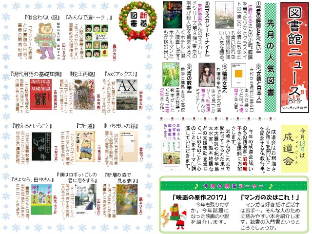 2017年12月05日(火) 図書館だより < お知らせ < 最新ニュース 図書館ニュース8号を発行しました 今回は本の紹介が盛りだくさんです。 今月13日に開催予定の「成道会(じょうどうえ)」も紹介しています。 プリントアウトはこちら