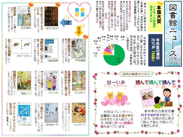 2018年02月07日(水) 図書館だより < お知らせ < 最新ニュース 図書館ニュース10号を発行しました 今年度の貸出はどんなジャンルが多いのかデータを掲載しています。 4月の本屋大賞発表にむけて、ノミネート作品も掲載しています。 プリントアウトはこちら