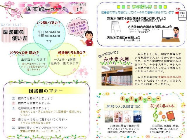 2018年04月07日(土) 図書館だより < お知らせ < 最新ニュース 図書館ニュース1号を発行しました 今年度最初の図書館ニュースです。 図書館のマナー、本の探し方など基本的なルールを紹介しています。 プリントアウトはこちら