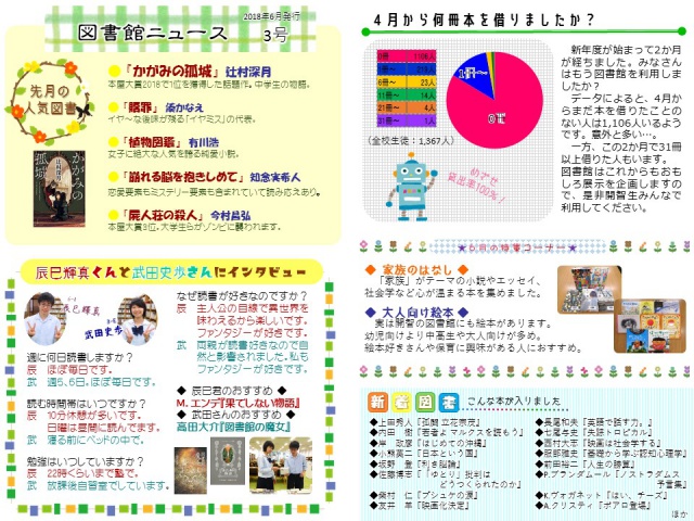 2018年06月02日(土) 図書館だより < お知らせ < 最新ニュース 図書館ニュース3号を発行しました 今回は図書館をよく利用する生徒にインタビューをしました。 毎日読書と受験勉強に励んでいるようです。 プリントアウトはこちら