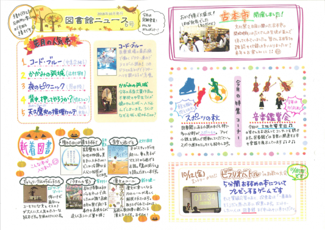 2018年10月02日(火) 図書館だより < お知らせ < 最新ニュース 図書館ニュース6号を発行しました 今回も手書き風の図書館ニュースです。 9月に開催した「古本市」は大盛況でした。 ご来場いただいた皆さん、ありがとうございました。 印刷はこちら