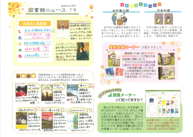 2018年11月03日(土) 図書館だより < お知らせ < 最新ニュース 図書館ニュース7号を発行しました 今回は半分だけ手書きにしました。 「読書感想画コンクール」の指定図書の紹介をしています。 コンクールに興味のある人は図書館まで申し出てください。 印刷はこちら