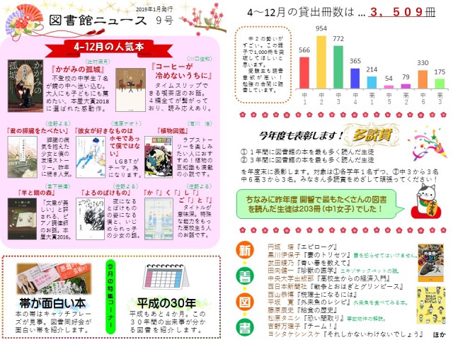 2019年01月10日(木) 図書館だより < お知らせ < 最新ニュース 図書館ニュース9号を発行しました 明けましておめでとうございます。 本年も開智図書館をよろしくお願いいたします。 印刷はこちら