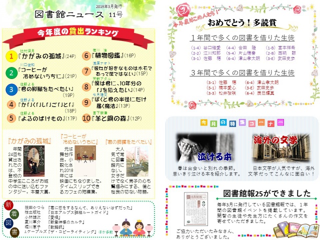 2019年03月06日(水) 図書館だより < お知らせ < 最新ニュース 図書館ニュース11号を発行しました 今年度最後の図書館ニュースです。 今回は「多読賞」を受賞した生徒を紹介しています。 受賞したみなさん、おめでとうございます! 印刷はこちら