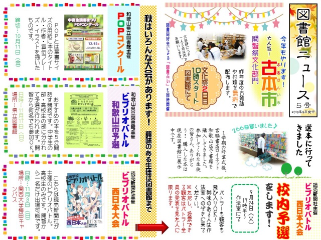 2019年09月06日(金) 図書館だより < お知らせ < 最新ニュース 図書館ニュース5号を発行しました 今月はビブリオバトルやPOPコンクールなど、秋のイベントのお知らせをしています。 また、高校文化祭では雑誌の無料配布【古本市】を図書館で行います。