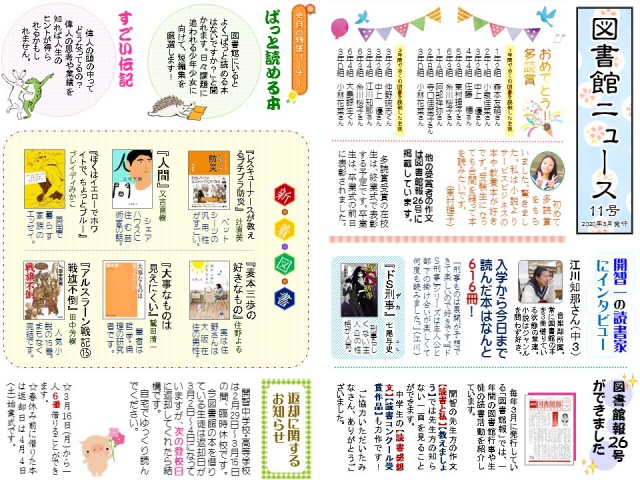 2020年03月02日(月) 図書館だより < お知らせ < 最新ニュース 図書館ニュース11号を発行しました 今回は新型コロナウィルスの影響により臨時休校が実施されているため、HP上でのみ図書館ニュースをお届けします。 今年度に図書をたくさん借りた生徒を表彰する【多読賞】を掲載しています。 みなさん、学校再開日にまた図書館でお会いしましょう。