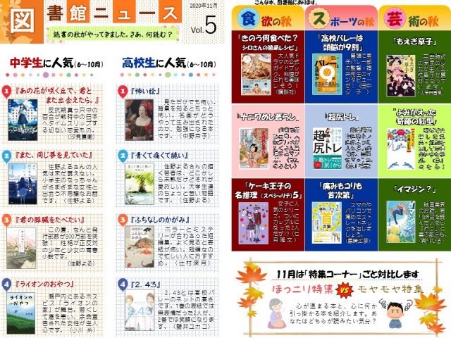 2020年11月11日(水) 図書館だより < お知らせ < 最新ニュース 図書館ニュース5号を発行しました 今回の図書館ニュースは「読書の秋」にぴったりの本を紹介しています。 また、中学生と高校生それぞれに人気の本も紹介しています。 住野よるさんの人気がすごいです。 今月後半の3連休に読んでみてはいかがですか?