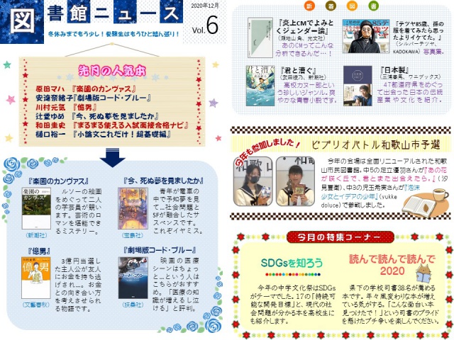 2020年12月07日(月) 図書館だより < お知らせ < 最新ニュース 図書館ニュース6号を発行しました 今月は和歌山市民図書館で行われた「ビブリオバトル和歌山市予選」を紹介しています。 また、今月の特集コーナーは「SDGs」と「読んで読んで読んで2020」がテーマです。 ぜひ図書館へ足を運んでください。