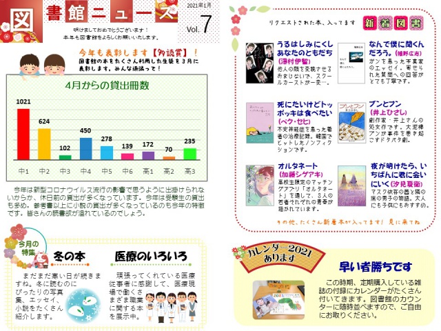 2021年01月14日(木) 図書館だより < お知らせ < 最新ニュース 図書館ニュース7号を発行しました 明けましておめでとうございます。 本年も図書館をよろしくお願いします。 新年最初の図書館ニュースです。