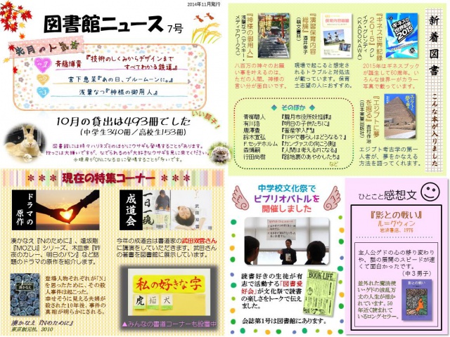2014年11月13日(木) 図書館だより < お知らせ < 最新ニュース 図書館ニュース7号を発行しました 先月貸出し回数が最も多かった本は、斉藤博貴さん『技術のしくみからデザインまですべてわかる鉄道』でした。 非常に読みやすい本です。中1の調べ学習で男の子たちが使ったのでした。 そのほか、先月行われた中学校文化祭ではじめて開催したビブリオバトルの様子を載せています。 「図書愛好会」という有志で集まった中3メンバーが中心になって、3分間でお気に入りの本を紹介しました。