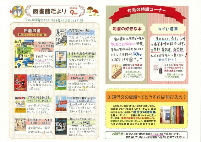 2021年09月02日(木) 図書館だより < お知らせ < 最新ニュース 図書館だより9月号ができました 今回の図書館だよりは半分手書きにしてみました。いかがでしょうか。 最近、図書館では国語の現代文の勉強に悩んでいる人のために、参考書を増やしました。 図書館内の「受験対策コーナー」に並べていますので、みなさんどんどん利用してください。
