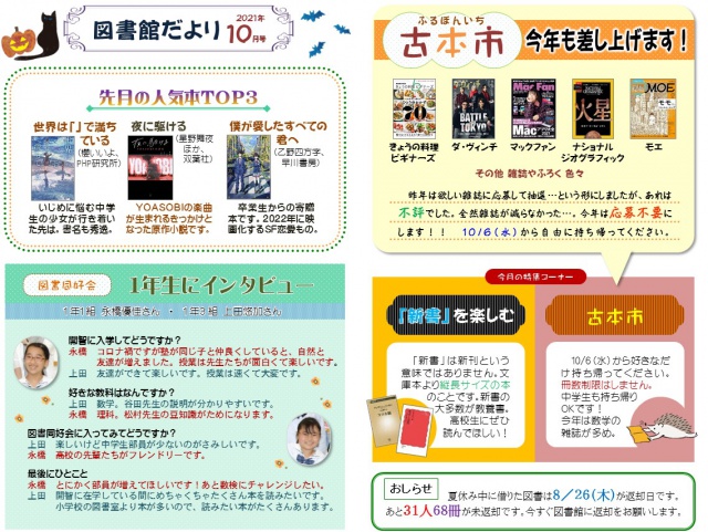 2021年10月07日(木) 図書館だより < お知らせ < 最新ニュース 図書館だより10月号 今月の図書館だよりでは「古本市」を案内しています。 「古本市」は毎年、高校の文化祭で雑誌のバックナンバーを無料配布しているイベントですが、今年は中高生だれでも・いつでも持ち帰ることができるようにしました。 雑誌だけではなく可愛い附録ももらえます。 みなさん、図書館に立ち寄った際には自由に持ち帰ってください。