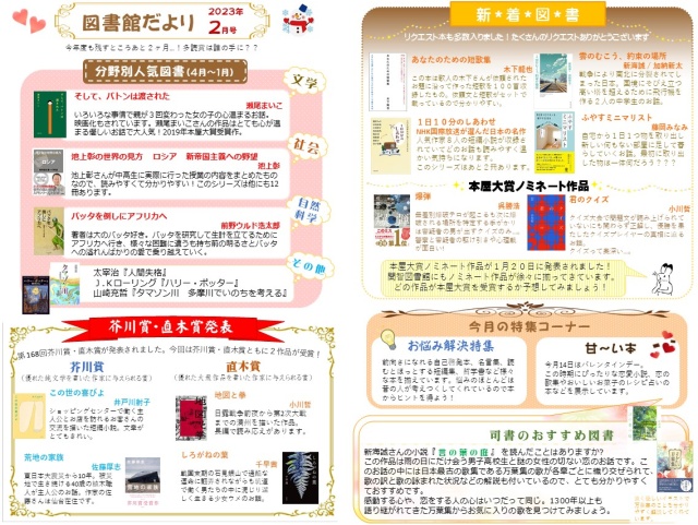 2023年02月17日(金) 図書館だより < お知らせ < 最新ニュース 図書館だより2月号ができました 芥川賞、直木賞の発表や本屋大賞にノミネートされた10作品が公開されたので、今月の図書館だよりには本の紹介をたくさん載せています。 本屋大賞ノミネート作品はとても人気で、すでにほとんどの作品が貸し出し中となっています。 どの作品が本屋大賞を受賞するか楽しみです。