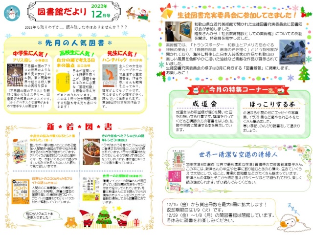 2023年12月09日(土) 図書館だより < お知らせ < 最新ニュース 図書館だより12月号ができました 今月の図書館だよりには、中高生別の人気図書と図書同好会の部員と参加した生徒図書充実委員会の様子を掲載しています。 テスト期間が終わり、放課後図書館で本を借りていく生徒が増えてきました。