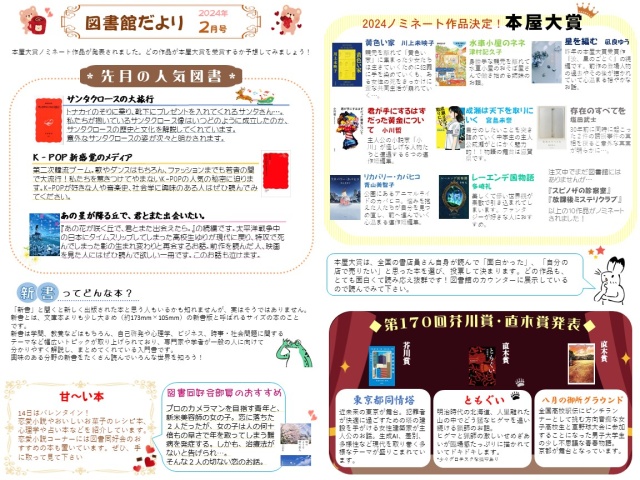 2024年02月19日(月) 図書館だより < お知らせ < 最新ニュース 図書館だより2月号ができました 今月の図書館だよりには、先月の人気図書、本屋大賞ノミネート作品と芥川賞・直木賞受賞作品の紹介を載せています。 高校1年生が国語の授業で新書を読む取り組みをしてくれているので先月の人気図書に新書がランクインしました。 また、本屋大賞ノミネート作品や芥川賞・直木賞の発表があったので、図書館に新着図書がたくさん届きました! ぜひ読みに来てください。