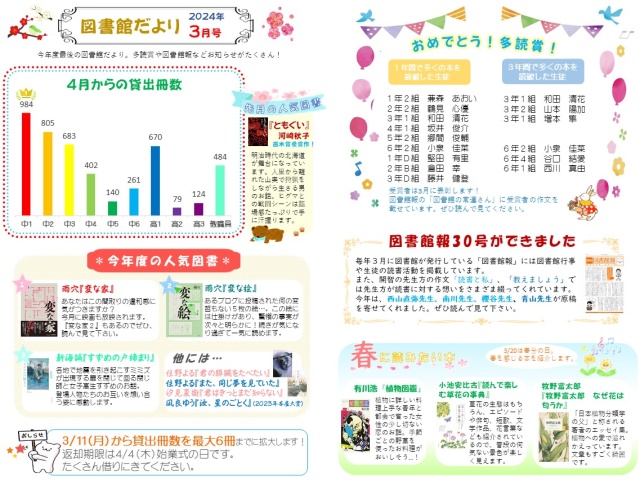 2024年03月08日(金) 図書館だより < お知らせ < 最新ニュース 図書館だより3月号ができました 今月の図書館だよりには、今年度の学年別貸出冊数、人気図書、多読賞受賞者を掲載しております。 11日(月)からは最大6冊本を借りられるので春休み前にたくさん借りに来て下さい。