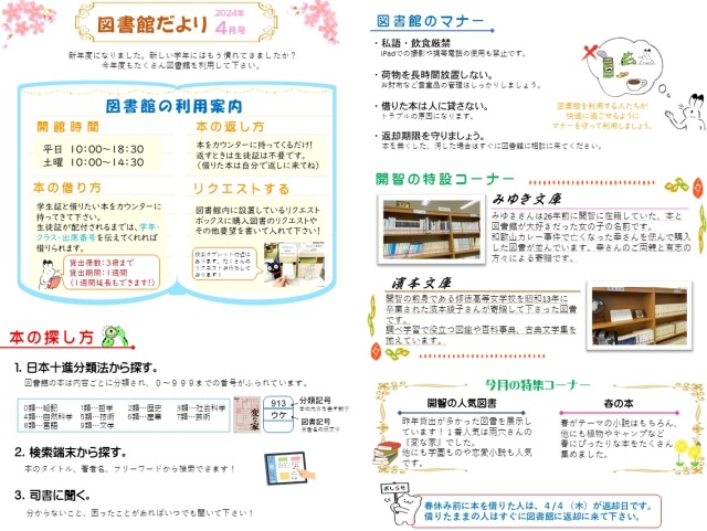 2024年04月18日(木) 図書館だより < お知らせ < 最新ニュース 図書館だより4月号ができました 今月の図書館だよりには図書館の利用案内を載せています。 オリエンテーションが終わり、休み時間や放課後に図書館で読書や自習をする新入生の姿が見られます。