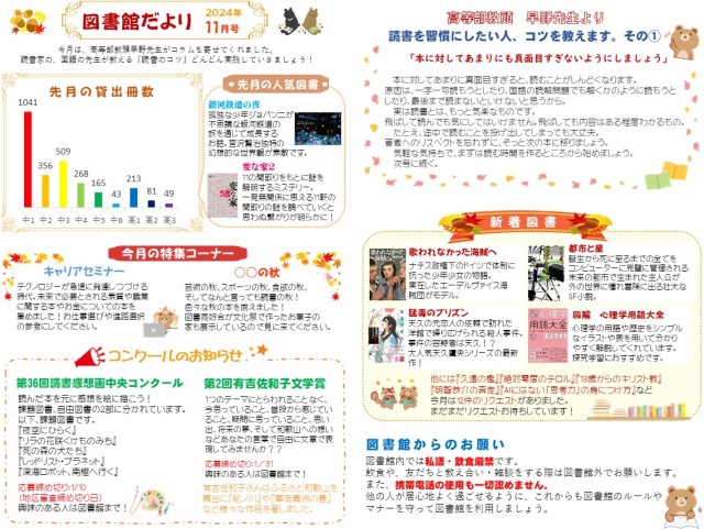 2024年11月21日(木) 図書館だより < お知らせ < 最新ニュース 図書館だより11月号ができました 高等部教頭早野先生がコラム「読書のコツ」を寄せてくれました。 読書を習慣にしたい人、まずは気軽に気楽に読書を始めてみませんか???