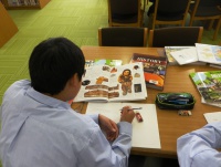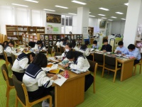 2015年05月02日(土) 図書館だより < お知らせ < 最新ニュース 中1が図書館で授業を行いました 中学1年生が社会の授業で図書館を使いました。 世界の国旗、歴史、風習、宗教など、自由にテーマを決めて調べます。 まずはプロジェクタで昨年の作品を見ながらテーマを考えました。 辞書や図鑑などさまざまな資料をもとに、ノートにまとめます。 色とりどりのペンを使って、カラフルな仕上がりになりそうです。 みんな図書館のどこにどんな本があるか分かったかな? 世界のミイラについて調べている子もいました。 エジプトのミイラ、アンデスのミイラ、中国のミイラ…非常に面白そうです。