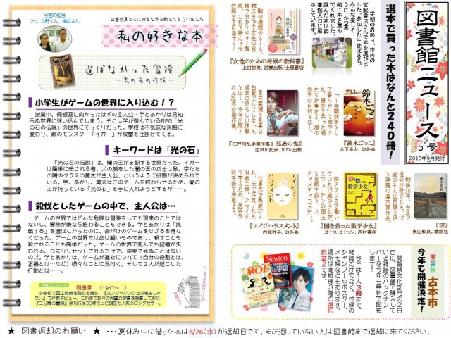 また、今回は図書委員さんのレポートを載せています。3年1組の図書委員さんが選んだテーマは「私の好きな本」。岡田淳さん著『選ばなかった冒険』の面白さを教えてくれています。