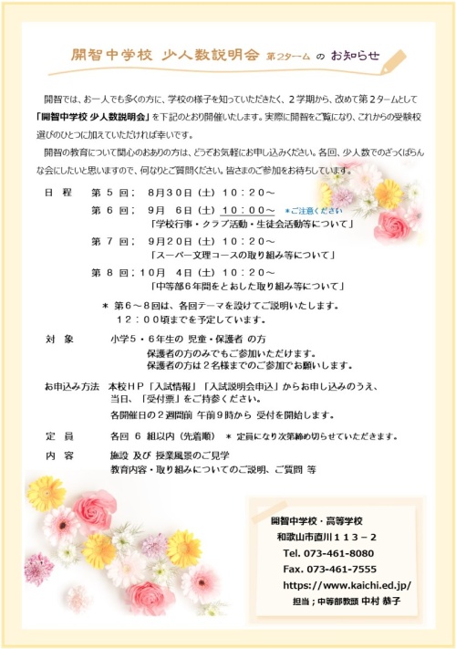 中学校 少人数説明会 第2ターム 開催のお知らせ