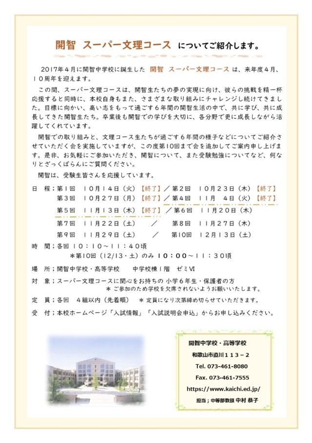 中等部 スーパー文理コース ご紹介の会 ご案内(土曜日にも開催しますのでお子様といっしょにお越しください。)