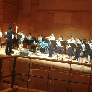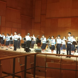 卒業生の保護者様からご縁をつないでいただき、なんと宮沢さんご本人と一緒に「風になりたい」を演奏させていただけるという、素晴らしい機会をいただき、中学生、高校生合わせて36名の部員が参加しました。お盆休み中でしたので、残念ながら参加できない部員もいましたが、開演前にはご来場いただいたお客様に向けて音楽部だけでの演奏もさせていただきました。リハーサルには中村教頭先生も駆けつけてくださり、音楽部にエールを送っていただきました。こちらは中村先生に撮っていただいたリハーサルでの写真です。