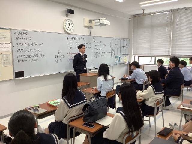 2024年05月20日(月) 学校ニュース < 最新ニュース 教育実習開始 本日から教育実習が始まりました。今年は14名の教育実習生を受け入れます。 今日はテストの後、各ホームルームクラスで自己紹介をしてもらいました。 実習生の話に皆さん興味津々でした。 大学生から様々な話を聞くことは、生徒の皆さんにとっても良い経験になるはずです。 今日はテストで、話す機会はあまりなかったようですが、明日から授業以外でも積極的に関わっていってくださいね。