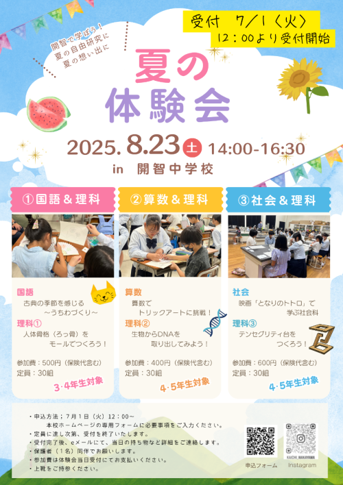 夏休みの思い出に,是非 開智中学校での楽しい授業を体験してみてください。