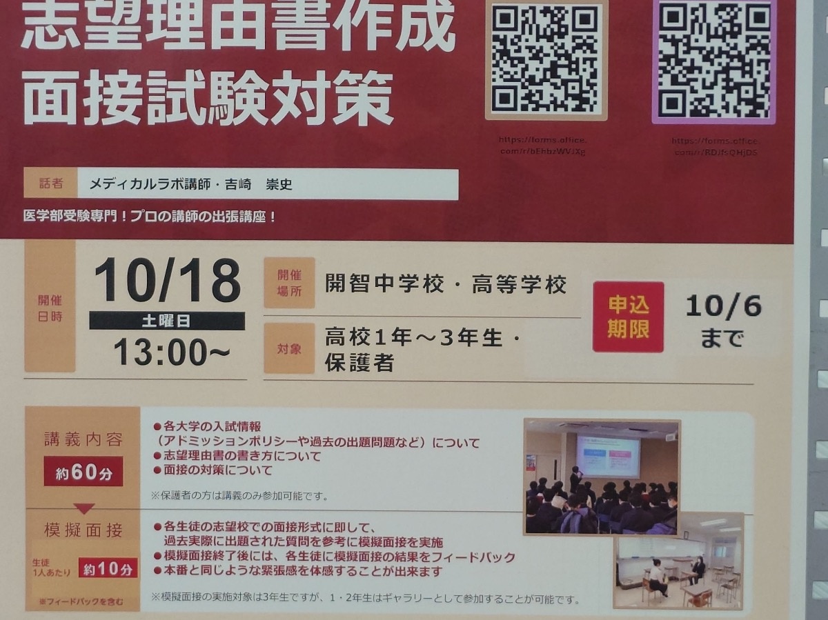 2025年10月18日(土) 学校ニュース < 最新ニュース 医学部対策講座 本日、医学部現役合格のための対策講座が行われました。 河合塾グループ医系専門予備校メディカル ラボより講師先生をお迎えし、 各大学の入試情報、志望理由書の書き方、面接対策について、お話しいただきました。 皆熱心にメモをとり、顔もよくあがって、みなぎる意欲を感じました。 その後、模擬面接をしていただきました。受験生の様子に後輩達は、自分ごとのように緊張したと、とても良い刺激をいただきました。