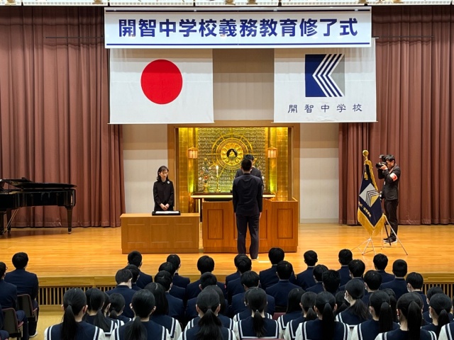 終業式と離任式の終了後、開智ホールにて、中学3年生の義務教育修了式が行われました。厳粛な雰囲気のなか、担任の先生方からの呼名に堂々と応える生徒たちの姿からは、3年前の入学式では見られなかった自信が伝わり、成長を感じました。