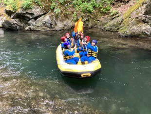 小雨の中、ラフティング班が現地に向かって出発しました。雨というのも悪くないらしく、川の水量が増加してスリルをより味わえるそうです。