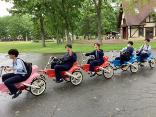 2025年06月11日(水) 行事 < 学校ニュース < 最新ニュース 中5修学旅行(1日目) ④ 昼食後はパーク内を自由散策しました。 心配していた雨もすっかり上がり、サイクリングや乗馬、お土産購入など、のんびりと過ごすことができました。 15時00分 ノーザンホースパークを出発しました。 道の駅「しむかっぷ」を経て、ホテルに向かいます。