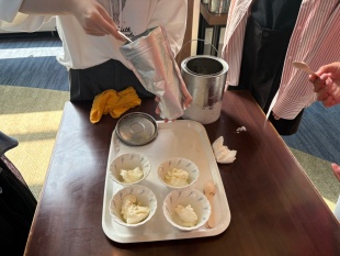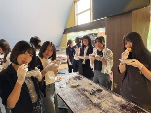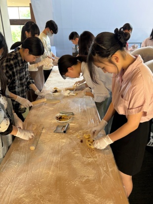 2025年06月12日(木) 行事 < 学校ニュース < 最新ニュース 中5修学旅行(2日目) ⑤ •アイス, パン, ジャムを、緑豊かな林の先にある工房で作りました。出来立てのアイスとパンは、びっくりするくらい美味しかったです。ジャムは小瓶に詰めて、お土産にします。