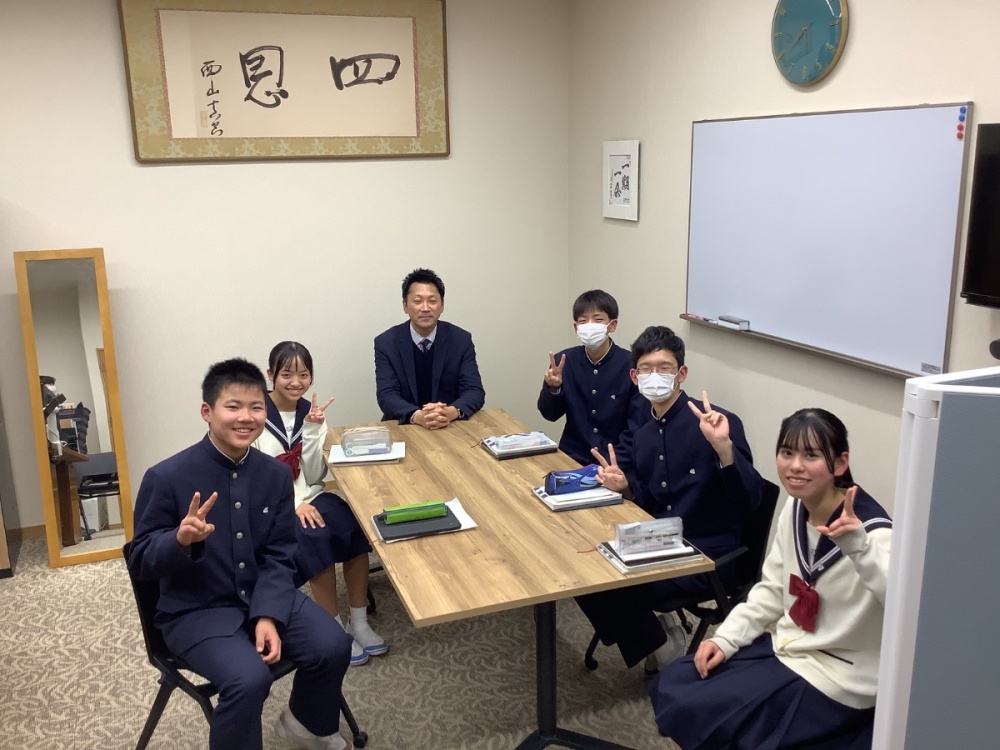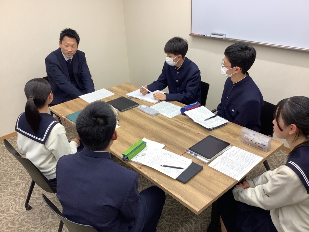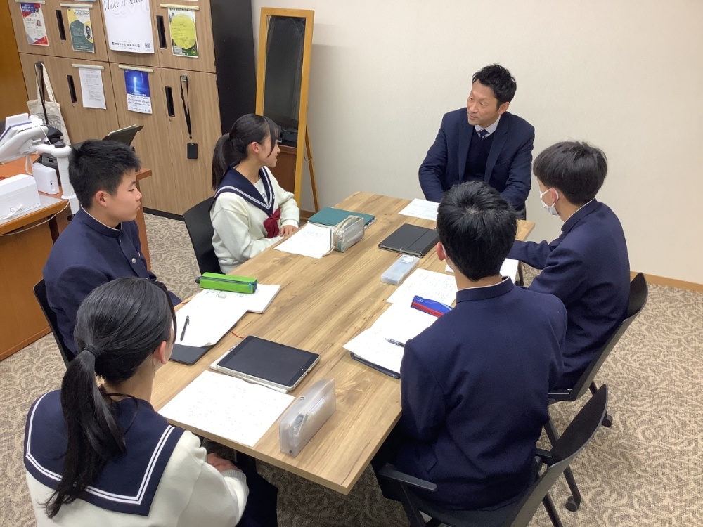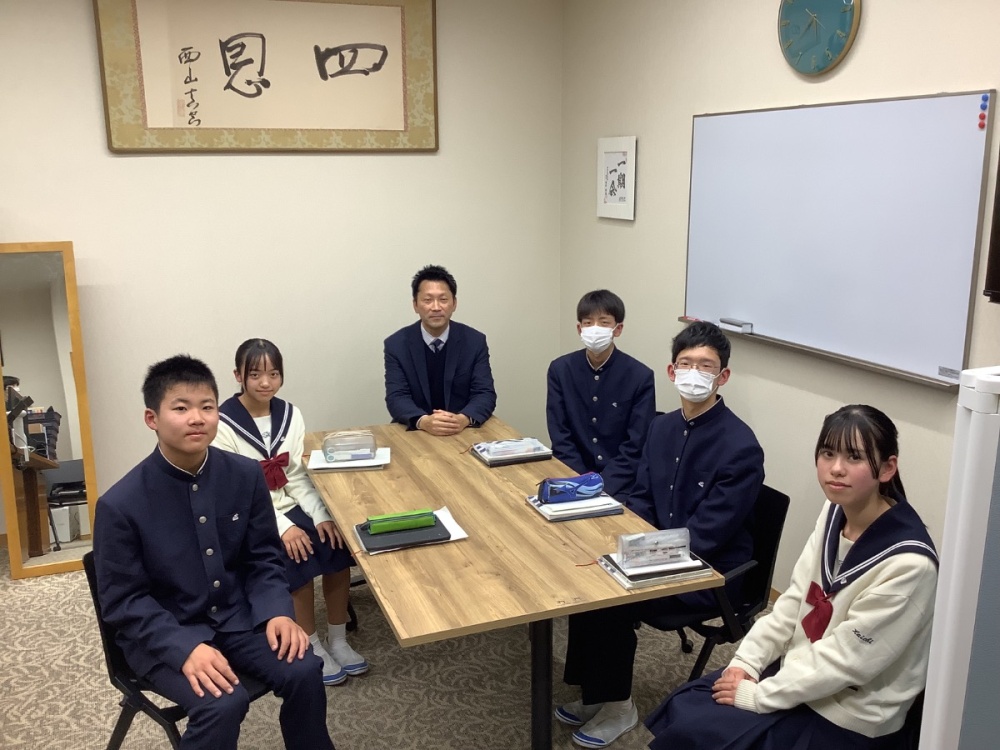 「髙松学校長と語る」と題し、校長先生に中学生徒会役員の皆さんと語り合う場を設けていただきました。校長先生には、含蓄がありながらも平易な語り口で分かりやすくお話いただいたお陰で、生徒の皆さんもメモを取りながら熱心に話を聴くことができました。