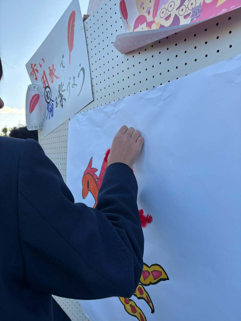 当日はたくさんの生徒が羽根を貼ってくれたおかげで、鳳凰の大きな翼が完成しました。