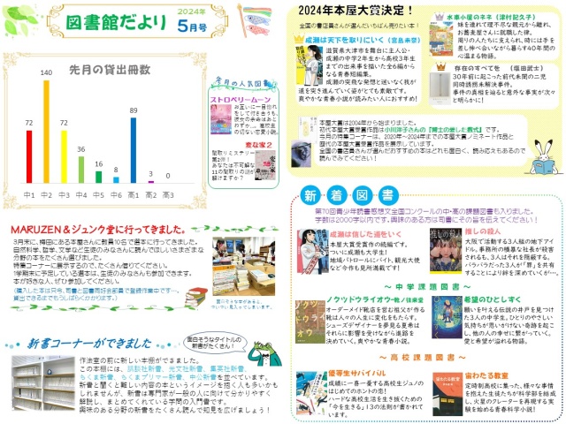 HOME (不使用2023)図書館だより 図書館だより5月号ができました 図書館だより5月号ができました 今月の図書館だよりには、各学年の4月の貸出冊数、新着図書の紹介を載せています。 テスト期間に入り、放課後の図書館は自習に励む生徒で溢れています。 定期考査でよい結果を出せるよう、この調子で頑張ってください!