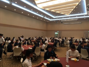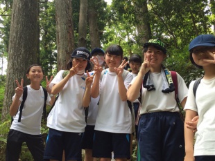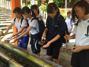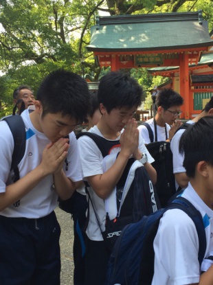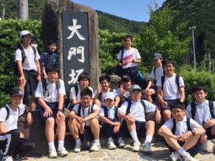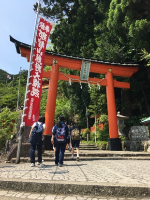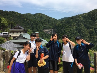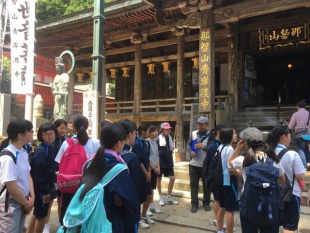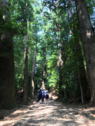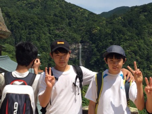 熊野古道ウォークでは語り部さんの説明を聞きながら歩きました。美しい景色を見ながら石段を歩き、爽やかで清らかな気持ちになったと生徒が言っていました。那智の滝の大きさに驚きながらも、歩いて良かったと感動する姿が見られました。