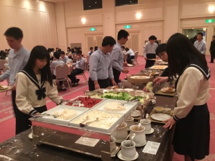 食材の種類が豊富で、一番人気は味噌ラーメン。わんこそばの早食いのごとく、テーブルにお椀が積み上げられて行きました。その後はデザート。チーズケーキにショートケーキ、エクレアにゼリーなど多種類あり、生徒たちは喜んで食べていました。