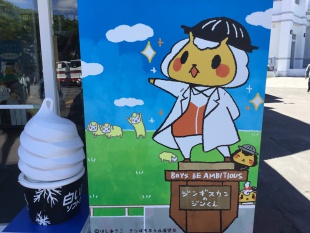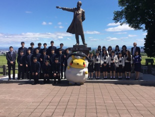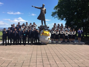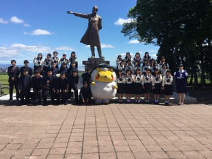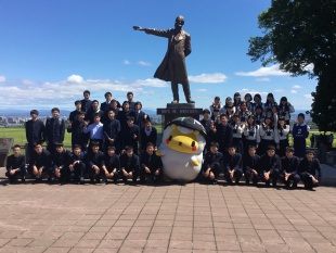 2018年06月15日(金) 過去のニュース 中5 北海道修学旅行 その25 羊ヶ丘展望台に到着しました。まず、「少年よ、大志を抱け」で有名なクラーク博士像の前でクラス写真を撮りました。その後少しの自由時間があり、景色をカメラに収めたりする生徒もいて、最高の見晴らしを堪能できたようです。(クラス写真の真ん中に映るのは、ジンギスカンのマスコットキャラクターのジンくん)